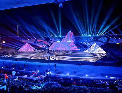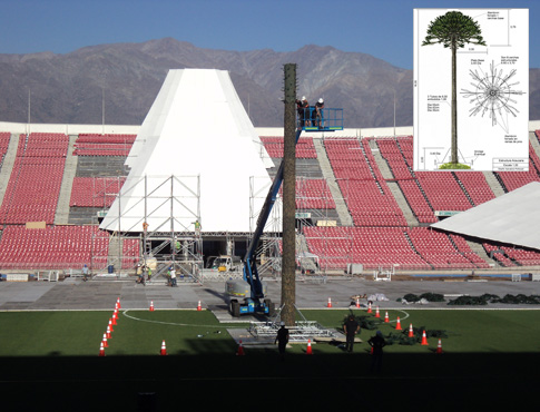 Montaje de pantallas gigantes de proyección en el Estadio Nacional / Stage of built mapping screens in the National Stadium |